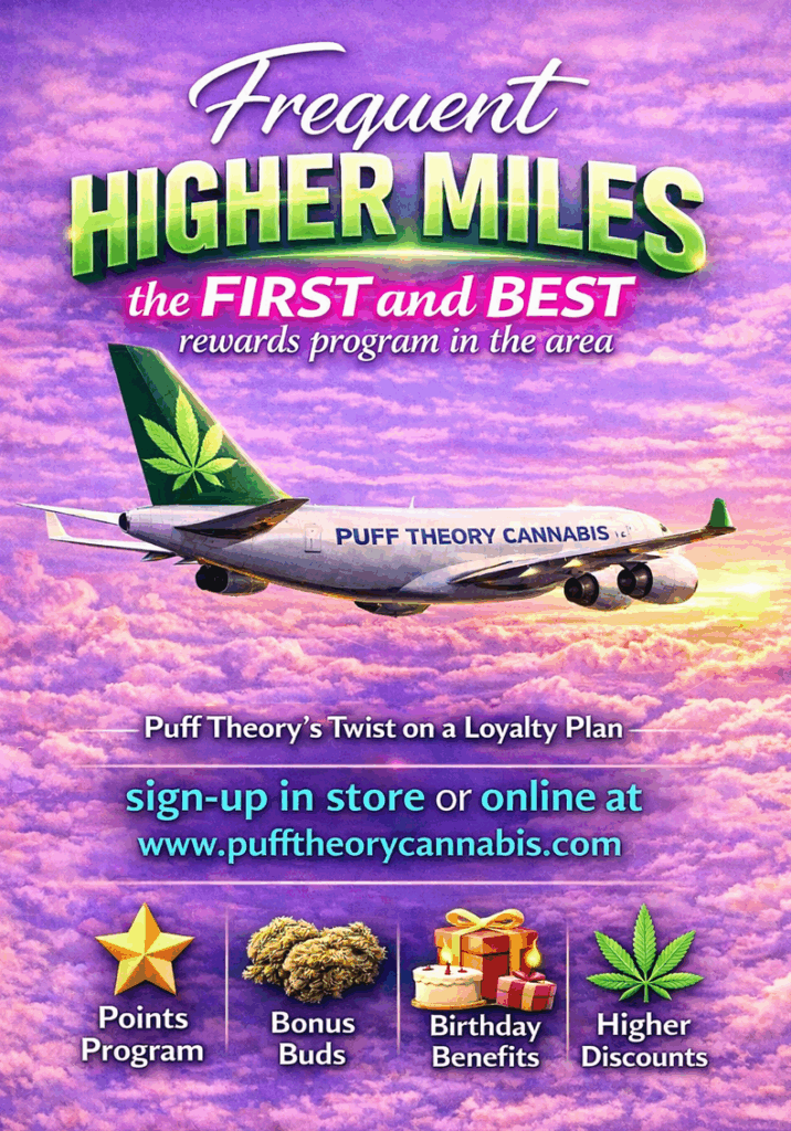 Earn points on every visit while unlocking VIP perks and exclusive member benefits. Join Puff Theory Rewards to elevate your cannabis journey with rewards that evolve alongside your experience.
